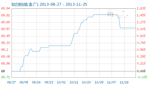 11月24日鈦白粉(硫.金.廠)商品指數(shù)為69.60,與11月23日持平,較周期內最高點100.00點(2011-09-04)下降了30.40%,較2013年08月25日最低點68.74點上漲了1.25%。