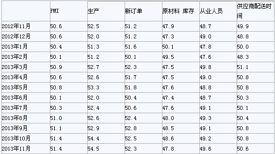 2013年11月,構(gòu)成制造業(yè)PMI的5個分類指數(shù)2升3降。生產(chǎn)指數(shù)為54.5%,比上月略升0.1個百分點,連續(xù)5個月回升,為2012年5月以來的最高點。新訂單指數(shù)為52.3%,比上月回落0.2個百分點。調(diào)查顯示,反映制造業(yè)外貿(mào)情況的新出口訂單指數(shù)為50.6%,比上月上升0.2個百分點,連續(xù)4個月位于臨界點以上;進口指數(shù)為50.5%,比上月上升0.5個百分點。